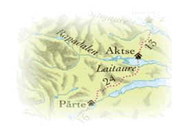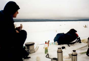 Das Ziel in Sicht!Mit etwa 26 km ist die zweite Etappe auf Skiern nicht gerade zum Erholen. Der volle Rucksack drückt schwer auf die Schultern. Es geht am Rande eines langgestreckten Sees entlang. Etwa bei der Hälfte biegt die Spur nach Norden ab. Wir "durchqueren" den See auf dessen Grund! Unter dem Eis ist das Wasser abgelaufen, sodass das Eis eingebrochen ist. Eine sehr merkwürdige Hügellandschaft bleibt dabei zurück, durch die wir nun laufen. Endlich sind wir über die letzte Hügelkette! Vor uns liegt noch eine Seeüberquerung, dann sind wir da. Die Hütte ist gut besucht, es finden sich aber noch fünf freie Betten. Die ersten Blasen an den Füßen werden untersucht... |