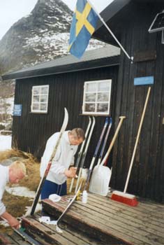 Skier präparierenAm Mittag sind wir in Vakkotavare. Der Hüttenwirt berichtet nichts Gutes. Zudem kommen am Nachmittag zwei Schweden, die am Morgen aufgebrochen waren, wieder vom Berg. Bis zur Brust standen sie im Schnee. Kein Durchkommen behaupten sie. Wieder ist große Diskussion angesagt. Aufgeben? Trotzdem weiter? Sich trennen? Eine Gruppe kommt dann am späten Nachmittag doch noch aus Teusajaure und bringt die Entscheidung. Obwohl sie berichten, dass auf dem See, den wir zu überqueren haben, das Wasser zum Teil einen halben Meter hoch steht, beschließen wir, am nächsten Morgen gleich nach Sonnenaufgang aufzubrechen. Bei hartgefrorenem Schnee muss es gehen! Also müssen die Skier entwachst und die Steighilfen angebracht werden. |