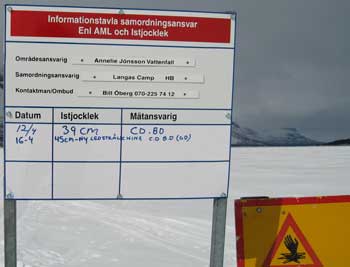 Sichere EisdeckeEine gute Stunde braucht der Bus bis Kebnats - der Bushaltestelle gegenüber der Fjälstation Saltoluokta. Wir haben uns entschieden zum Abschluss nochmal so richtig Luxus zu geniesen. Zuvor gilt es aber nochmals drei Kilometer über eine schon dünne Eisdecke zu rutschen. Die Fahrspur ist abgesteckt und macht einen langen Umweg. Wir sehen offene Wasserstellen... Ein Schild weist auf die Dicke des Eises hin und wann es gemessen wurde.