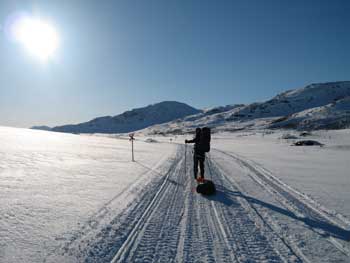 Der zweite TagWir haben lange diskutiert und sind uns einig nicht dem Kungsleden in direkter Linie zu folgen. Nach Westen liegt Unna Allkas. Ein am Vortag spät noch angekommener Schwede empfiehlt uns die Route wärmstens. Man sehe die norwegische Seite von dort aus sehr schön. Und es soll weniger los sein. Da kann man nicht wiederstehen. Also machen wir uns an die 24 Kilometer immer leicht bergauf entlang und auf dem Kamajakka. Um 11 Uhr kommen wir los. Die Temperatur liegt zwischen -4 und -1 Grad. Strahlender Sonnenschein! |