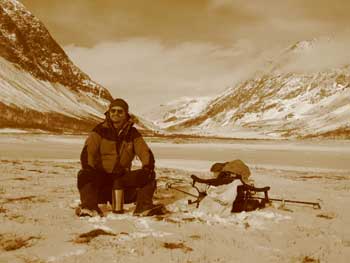 Teepause in VistasvaggiNachdem wir unsere ganzen, mühsam eroberten Höhenmeter wieder zu Fuß abgestigen sind die erste Pause. Die Sonne kämpft noch mit den Wolken. Noch ist nicht ganz klar wer gewinnt! Der Weg läßt sich nicht verfehlen. Es gibt eine gut sichtbare Scooterspur und teilweise folgt er auch direkt dem Flußlauf. Recht wenig Schnee, denke ich. Ab und zu müssen wir über blanke Eisstrecken laufen. Zum Glück haben wir die Stahkanten an den Skiern. |