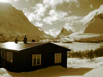 Sonnenklar der Nallo PeakUm vier Uhr am Nachmittag erreichen wir Vistas. Zeitgleich kommt eine Gruppe von acht NorrländerInen an. Wieder wird die Bude voll. Wir speisen mit der Gruppe und unterhalten uns vortrefflich. Getrocknetes Rentierfleisch wird mir angeboten. Scheint ein gemütliches völkchen zu sein da in Norrboten. Wir werden uns die nächsten zwei Tage immer wieder treffen. Sie fahren die selbe Strecke wie wir. |