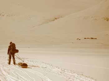 Und wieder in SälkaSchnell erreichen wir den Ausgang des Tals, und sehen die Sälka Hütten unter uns liegen. Gegenüber ragt das Sälka Massiv über 1800 Meter in den wolkenlosen Himmel. Ein bisschen Bammel vor der Abfahrt hinunter zu den Hütten habe ich ja. Im Sommer kam mir das alles noch recht steil vor. |