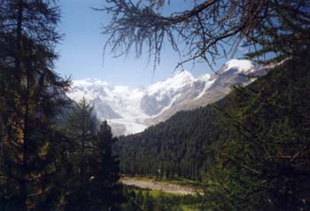 Bernina und Piz PalüNach der rasanten Abfahrt über viele Serpentinen sind wir im Oberengadin angekommen. Das Klima scheint hier deutlich milder und trockener zu sein. Wir haben einen glasklaren Blick auf einige Viertausender. Der riesige Campingplatz in Pontressina liegt mitten in einem weit verzweigten Bach in lichtem Wald. Wir finden ein schönes Plätzchen, und müssen dann doch früh in den Schlafsack kriechen. Es wird am Abend schnell kalt auf 1800 Meter. |