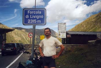 Der zweite PassNur etwa zweihundert Höhenmeter türmen sich vor uns auf. Die aber haben es in sich. Ziemlich viel Verkehr, sängende Sonne in der Felsenwüste und 12-14% Steigung. Wir sind bedient. Nach der italienischen Grenze kurz hinter dem Pass werden wir für die Mühen doch noch belohnt. Die Nordostseite des Livignio Passes ist grün und sanft. Wir steuern den nächsten Campingplatz an und gönnen uns mal wieder ein Restaurant. |