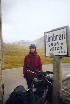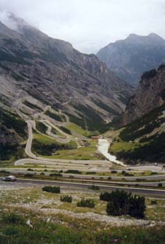 Serpentinen in MassenWie eine Wand ragt der Hang, durchzogen mit endlosen Serpentinen, vor uns auf. Haben wir's da oben schon geschafft? Der Kilometerzähler belehrt uns eines Besseren. Nicht einmal die Hälfte der Strecke, geschweige denn der Höhenmeter. Irgendwann sind wir oben und ein Hochtal tut sich vor uns auf. Mit leichter Steigung geht es etwa 4 Kilometer rasch voran. Es kann doch nicht mehr weit sein! Am Abzweig zum Umbrailpass sind unsere Kräfte fast am Ende. Immer noch 300 Höhenmeter. Der Kräfteverschleis der letzten Tage macht sich bemerkbar. Wie am Sustenpass werden die Pausen immer länger, das Anfahren immer schwerer. Das Ziel aber, haben wir mittlerweile vor Augen. |
