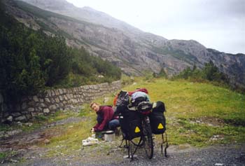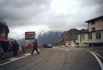 Und gleich der erste Hungerast...Die Wetterwechsel in den Alpen sind wirklich erstaunlich. Nach dem heisen Tag gestern, hat es heute nacht geregnet. Nun ist es überall sehr feucht. Wir machen auf dem lieblosen Campingplatz kein Frühstück, und fahren bis Bormio. Dort gibt es ein paar Stückchen vom Bäcker. Dann geht es los. 31 Tornanti stehen uns bevor. Alle durchnummeriert. Zudem viele unbeleuchtete, dunkle Tunnels und Galerien. Eigentlich ein Alptraum. Aber es ist das Stiftser Joch. Eine der höchsten Passstraßen in den Alpen. Nach einem Drittel der Strecke rächt sich das schlechte Frühstück. Eine dicke Nudelsuppe muß her! |