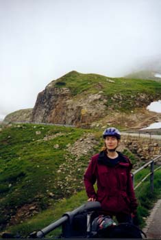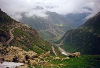 Schaffen wir es noch?Seit Stunden fahren wir nun mit einem Schnitt von 4-8 km/h den Berg hinauf. Die Verschnaufpausen kommen in immer kürzeren Abständen und werden von Mal zu Mal länger. Hinter der nächsten Kehre muss doch endlich der Pass sein! Der Blick zurück ist beeindruckend. Man könnte natürlich auch einfach wieder zurückrollen... |