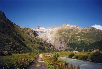 Wo ist der Rhonegletscher?Im Tal angekommen raucht ein kleiner Bach. Das soll einmal die stolze Rhone werden? Einst war der Gletscherabbruch hier an dieser Stelle. Jetzt braucht man ein Fernglas, um die Reste überhaupt am Hang zu finden! Ein paar Kilometer fahren wir noch bis Ulrichen. Am Fuße des Nufenenpasses schlagen wir dann das Zelt auf. |