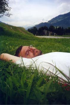 Ruhe in FriedenEigentlich nur als Überführungsetappe in Richtung Stilftser Joch geplant, artet die heutige Tour zur Tortur aus. Auf kleinen Nebenstraßen fahren wir zunächst das Vorderrheintal hinunter. Dabei geht es immer wieder steil bergauf, und anschließend ebenso steil bergab. Anstrengender als jeder Pass! Eine Ruhepause nutze ich gleich führ ein kleines Nickerchen. |