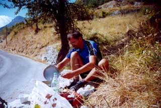 Essen muss sein!Das ewige Auf und Ab macht hungrig. Die letzten Reserven werden aufgebraucht. Das Tal ist zu steil, um einen guten Rastplatz zu finden. Außerdem ist es extrem trocken. Gestern konnten wir schon eine Waldbrand-Löschaktion beobachten! Also Vorsicht mit dem Benzinkocher. |