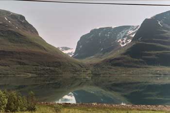 WindstillDas Wetter verwöhnt uns. Es ist nahezu windstill und der Fjord liegt vor uns wie ein Spiegel. Wir kommen schnell voran. Unsere Kondition ist mittlerweile so gut, dass der erste Hungerast erst nach 30 Kilometern kommt. Hier gibt es dann eine ordentliche Pause. Nach einem sättigendem Essen erreichen wir die E6. Es mangelt an Alternativen auf diesem Stück der Reise. Am heutigen Sonntag habe ich allerdings den Eindruck, dass etwas weniger Verkehr als gestern herrscht. |