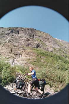 SchotterpisteAm Morgen kommen wir spät aus dem Zelt. Unser dänischer Kollege sitzt schon beim Frühstück. Er kommt aus der Gegenrichtung und erzählt uns vom schlechten Straßenzustand Richtung Süden. Es hilft nichts. Wir müssen da durch. Erst gegen Mittag kommen wir in die Gänge. Die Unterhaltung mit dem Dänen war interessant. Wieder mal fachsimpeln und hören, was man noch so für Touren machen kann... Nach dem Aufbruch merken wir schnell, was "schlechte Straße" bedeutet: Das Wasser schiebt immer wieder Gerölllawinen vom Hang. Deshalb wohl auch der Tunnel. Einfach zu aufwändig, immer wieder die Straße freizuschieben. Nach zwei Kilometern mündet der Weg in die normale Straße. Eine kleine, ruhige Straße mit wenig Verkehr. Gute Entscheidung, die Fjordseite gewechselt zu haben! |