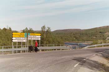 Rauschendes WasserEndlich ist die Grenze erreicht. Außer zwei Supermärkten ist hier allerdings nichts zu sehen. Ziemlich erschöpft gönnen wir uns eine Kaffeepause. Wir stehen auf einer Art Hochebene. Bäume gibt es hier keine mehr. Hinter der Grenze geht es dann stetig bergab Richtung Meer. Erstaunlich: Kaum auf norwegischem Gebiet, wird die Landschaft abwechlungsreicher. Steile Felsen, rauschende Bäche. Sowas hatten wir in Finnland vergeblich gesucht. Gegen 19 Uhr stehen wir an der Kreuzung zur Europastraße 6. Diese verbindet Oslo mit Kirkenes, im äußersten Nordosten Norwegens. Noch 25 Kilometer! |