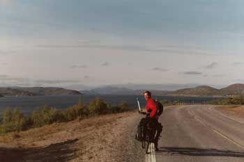 Wie weit noch?Die letzten Kilometer ziehen sich wie Kaugummi. Unser Schnitt fällt unter 15km/h. Die Schatten werden länger und länger. Aber sie bleiben! Keine Sorge wegen einbrechender Dunkelheit. Nein. Wir wissen, dass es hier im Moment nicht dunkel wird. Erschöpft erklimmen wir eine letzte Steigung. Das Gelände hier ist schroff und felsig. Militärisches Sperrgebiet zudem. Selbst wenn wir wollten, hier dürften wir nicht Zelten. Nicht einmal Anhalten ist erlaubt. Vorbei führt die Straße am Flugplatz Kirkenes. Deshalb das Sperrgebiet. Wir befinden uns am nördlichsten Außenposten der Nato. Kurz danach erreichen wir völlig erschöpft den Campingplatz. Dieser liegt, für uns günstig, einige Kilometer vor Kirkenes. |
