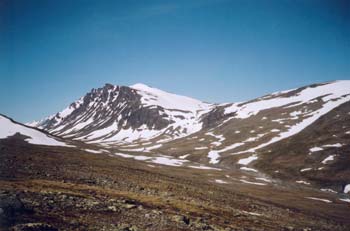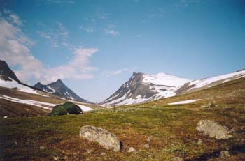 SchotterpisteNach einer Woche Wandern machen mir meine Füße zu schaffen. Überlastet durch das ewige Steinewandern, brennen sie abends wie die Hölle. Da helfen nur noch ein paar Aspirin. Zudem nervt uns die Sonne. Schon um Fünf Uhr morgens wird es im Zelt brütend heiß. Keine Chance mehr zu schlafen. Aber ein so schöner Blick auf den Nijbás und den Kaskasatjåkka mit 1902 bzw. 2076 Metern Höhe entschädigen dafür doppelt! Um uns ein bißchen Ruhe zu gönnen, planen wir deshalb heute nur zur Kakevagge abzusteigen. Die mühsam gewonnenen Höhenmeter von gestern gehen dabei fast alle wieder drauf! |