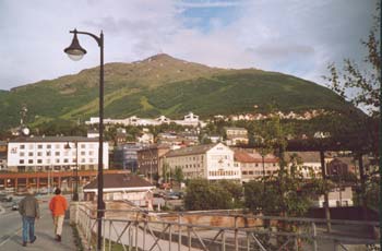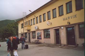 NarvikLeider müssen wir in Abisko das Zimmer räumen. Eine Gruppe Japaner hat sich angekündigt. Wir entscheiden uns für einen Besuch in Narvik. Soll ja interessant sein, und die Bahnfahrt dahin verspricht spektakuläre Blicke in den Rombaksbotn. Weit gefehlt! Schienenersatzverkehr. Sowas gibt's auch in Schweden. Mit Verspätung, dafür kostenlos, kommen wir gegen Mittag in Narvik an. Auch die Busfahrt über das Haugfjellet war beeindruckend - viel felsiger die Landschaft als die in Schweden. |