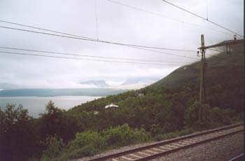 Mit einer Stunde Verspätung geht es dann endlich auf die Reise. Diesmal auf dem Schienenweg. Und wirklich, der Zug windet sich die steilen Fjordwände empor. Immer wieder dunkle, feuchte Tunnels. Der Ausblick auf den Fjord wird allerdings durch Wolken und Nebel getrübt. Nun ja, man kann nicht alles haben. Ein letzter Blick auf Lapporten ist uns dann doch noch gegönnt. Im Vorbeifahren nehmen wir Abschied von Lappland, und ertränken die aufkeimende Schwermut mit Bier im Speisewagen. |