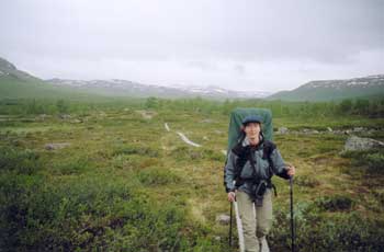 Der erste AnstiegJe höher wir kommen, desto stärker wird der Wind. Es ist noch nicht richtig ungemütlich, aber lauschig kann man das Wetter auch nicht nennen. Oberhalb der Baumgrenze machen wir Rast und der Spirituskocher kommt zu seinem ersten Einsatz. Bis nach Alesjaure sind es 20 Kilometer. Das ist uns heute zu weit, und wir beginnen am Abend mit der Suche nach einem schönen Stellplatz. |