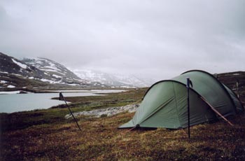 Über der BaumgrenzeMan sollte meinen, oberhalb der Baumgrenze fände sich recht schnell der passende Zeltplatz. Doch weit gefehlt. Immer ist es entweder zu sumpfig, es gibt zu viel Buschwerk, oder die Ebene ist zu schief. Oder es gibt kein Wasser in der Nähe. Wir sind vermutlich einfach noch zu wählerisch... Am Ende sind wir bis auf 8 Kilometer an Alesjaure herangekommen und waren 6 1/2 Stunden unterwegs. Diesmal klappt der Zeltaufbau besser. Trotzdem flattert das Zelt in der Nacht recht heftig. Es stürmt und wir finden nicht viel Schlaf. |