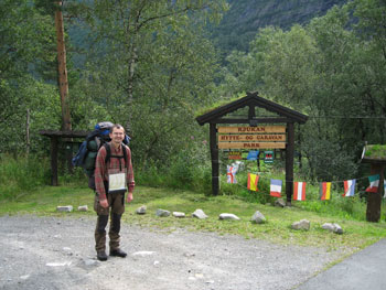 Die erste ZeltnachtEs ist früher Abend und wir spazieren auf einer stillgelegten Industriebahn, die hinter dem Campingplatz liegt, noch ein bisschen das Tal hinauf. Im Westen sieht man den höchsten Berg der Hardangervidda in Wolken: der Gaustatoppen. |