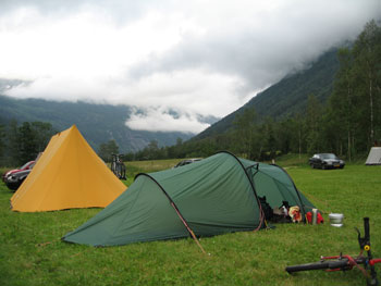 Ankunft in RjukanAuf der Karte haben wir einen Campingplatz gefunden. Der Busfahrer lässt uns rechtzeitig aussteigen und wir bauen zum ersten Mal in diesem Urlaub unser Zelt auf. |