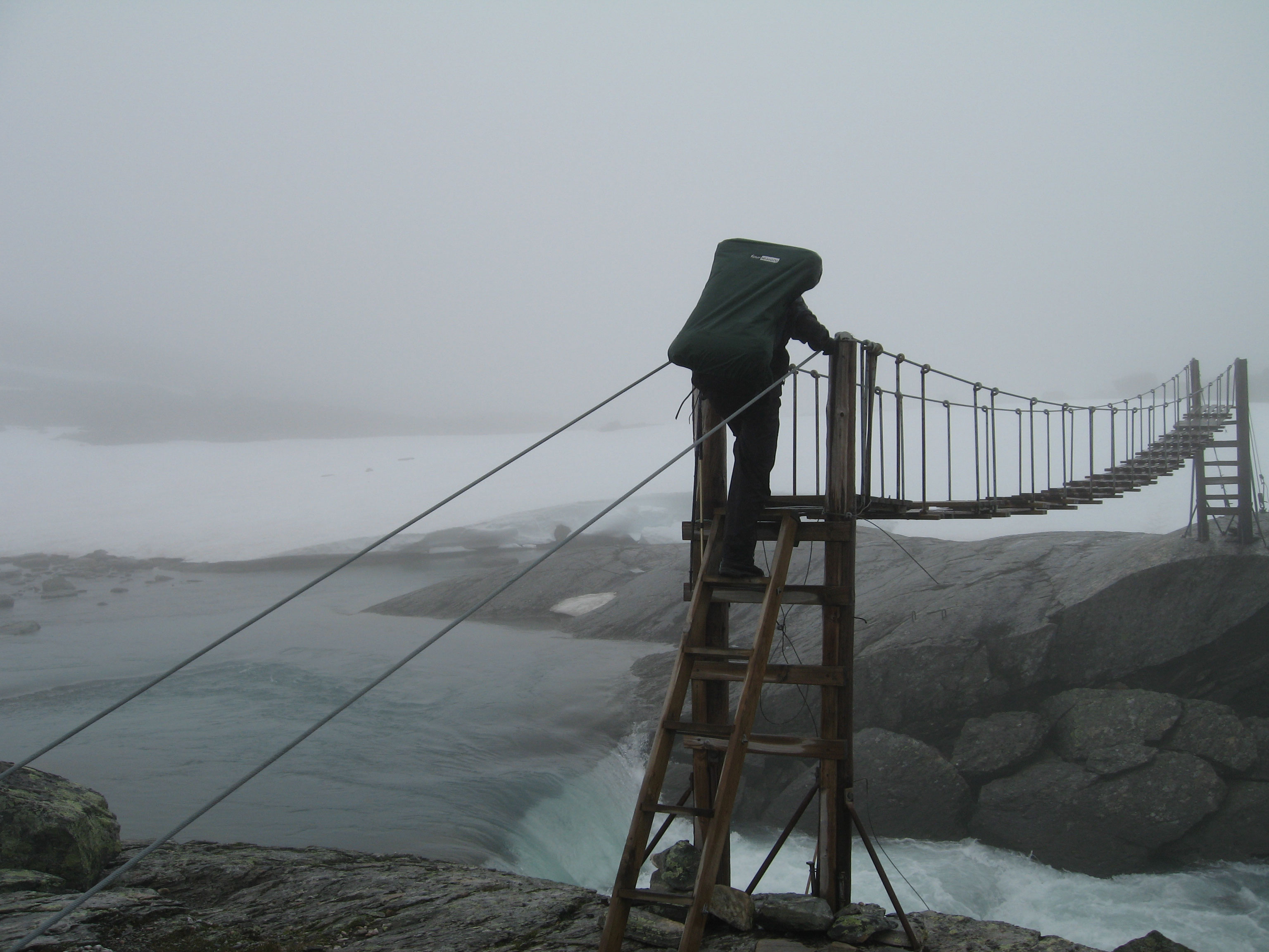 Tosende WasserVor der kuscheligen Hütte ist allerdings eine weitere, noch erstaunlichere Brücke zu bewältigen: es fehlen ein paar Bretter. In einem höllen Lärm stürzt das Wasser aus dem Nutavatnet in die Tiefe. Der Stresspegel steigt - jetzt fallen und es ist vorbei... Mit weichen Knien erreiche ich das andere Ufer. Das Wasser wird direkt aus dem Gletscher gespeist. Entsprechend viel und kalt muss es sein. |
