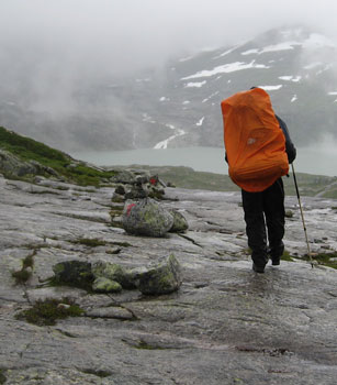 Nach zwei Stunden haben wir den flachen Teil der Etappe hinter uns gelassen und stehen vor dem Abstieg. Vierhundert Meter zum Rembesdalsvatnet mit der gleichnamigen Hütte geht es hinunter. Die Felsplatten sind durch Moosbesatz und den Dauernieselregen höllisch glatt. Nur langsam kommen wir voran. |