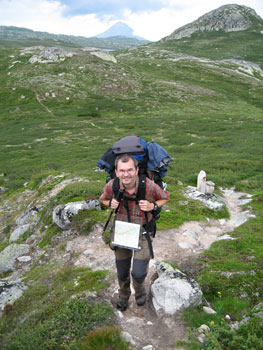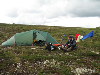 Über der BaumgrenzeNach einer halben Stunde Fußweg haben wir die letzten Birken hinter uns gelassen und befinden uns auf der Hochebene der Hardangervidda. Der anfangs noch befahrbare Weg wandelt sich in einen schmalen, gut erkennbaren Pfad. Wir lassen die erste, unbewirtschaftete DNT-Hütte, die Helberghytta, links liegen, und stellen unser Zelt nach vier Stunden Marsch und zirka zehn Kilometern zum ersten Mal in die Wildnis. Das Wetter ist noch ganz brauchbar, wenn auch Wolken aufziehen und es ohne Sonne kühl wird. Wir können dennoch vor dem Zelt Essen - Nudeln mit Tomatensauce. |