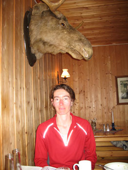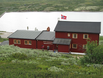 Der dritte Wandertag beginnt freundlich. Relativ früh starten wir die ersten fünf Kilometer zur STT Hütte Kalhovd. Nach kurzem Anstieg auf 1200 Meter geht es 150 Höhenmeter hinab zur Hütte, die neben der Staumauer des Kalhovdfjorden gebaut wurde. Wir haben Glück. Es gibt noch Lunch! Wir stärken uns unterm Elch und brechen nach einer guten Stunde Pause wieder auf. |