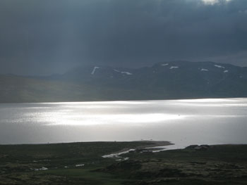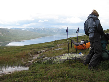 Erst noch sonnig...Steil geht es hinter der Hütte auf 1300 Meter hinauf. Noch spiegelt sich die Sonne im Wasser unter uns. Die Wolken verdichten sich allerdings zusehends. Noch ein Thema beschäftigt uns: Spiritus gibt es auf den Hütten wohl nicht zu kaufen. Anders als in Schweden ist der Trangia hier anscheinend nicht so beliebt. Man macht uns wenig Hoffnung, dass dies auf den kommenden Hütten anders werden könnte. |