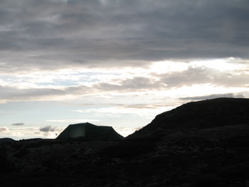 Zelt im AbendlichtEs hat aufgehört zu regnen und wir sind inzwischen wieder trocken. Bis nach Marbu, der nächsten bewirtschafteten Hütte, ist es uns zu weit. Wir stapfen durch den Matsch und finden auf einer Bergkuppe ein trockenes Plätzchen für unser Zelt. Der Sonnenuntergang gegen elf Uhr abends entschädigt für die feuchte Bachquerung. |
