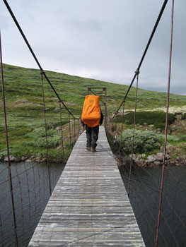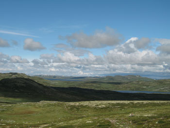 Gute AussichtenJe nach Richtung, in die man schaut, kann man gutes oder schlechtes Wetter sehen. Natürlich ist es in Wanderrichtung eher schlecht. Im Osten grüßt der blaue Himmel nach wie vor. Nach fünf Tagen Camping steht uns der Sinn nach Luxus. Wir wollen in Rauhelleren speisen und Übernachten. Auch müssen wir den Spiritus rationieren. Da kommt die Möglichkeit zum Abendmahl und Frühstück in der Hütte gerade recht. Wir verfehlen unterwegs die 1400er Höhenlinie am Krossvasshovda nur knapp. Der Wind trifft aus Westen ungebremst auf die Westflanke des Hügels. Es pfeifft ganz ordentlich. |