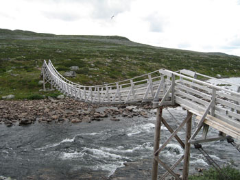 Unten in der Talebene wird es sehr feucht. Erst von unten, und dann kommt auch noch Regen von oben. Wir sind mal wieder bedient. Schön sind dann allerdings die beiden Hängebrücken, die wir queren. |