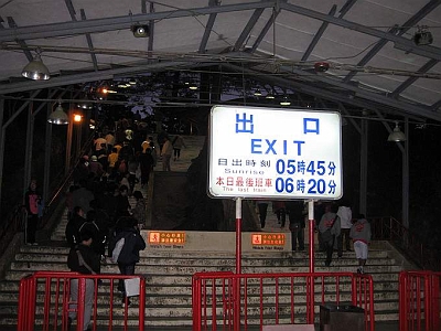 Wie überall hier ist man auf die Menschenmassen gut vorbereitet. Die aktuelle Sonnenaufgangszeit ist minutengenau angegeben. Ebenfalls, wann man mit der Bahn wieder ins Tal fahren kann. Angenehm frisch ist es hier auf 2500 Meter Höhe. Etwa 300 Menschen stehen am Hang und warten geduldig auf das Erscheinen der Sonne.