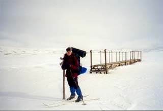 Eine Brücke im Nirgendwo?Auch im Sommer wird das Gebiet von Touristen bevölkert. Hier gibt es wohl irgendwo einen Fluss oder See. Um kurz nach vier sind wir in Helags. Hier treffen wir wieder auf die Gruppe Franzosen vom Vortag. Lautstark wird hier ein dreigänges Menü gekocht... Wir verziehen uns zunächst in die Sauna. Der Wind nimmt wieder zu. Im Schneegestöber sehen wir dann unsere Freunde sich in der Dämmerung die letzten Meter zur Hütte kämpfen. Wir sitzen derweil in der heißen Sauna! |