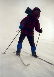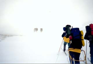 Natürlich wieder Wind...Allerdings legt er sich nach anfänglichen Sturmböen gegen Mittag. Jetzt können wir die Tour genießen. Im Wind muss man sich aber schon gut vermummen, um insbesondere die Augen vor dem aufstiebenden Schnee in Sicherheit zu bringen. Meist kommt er von schräg hinten und bläst uns den leicht schrägen Hang hinunter. Auf halbem Weg befindet sich eine Nothütte. Dort machen wir eine Mittagspause. Als wir gerade aufbrechen wollen, kommen unsere Bekannten. |