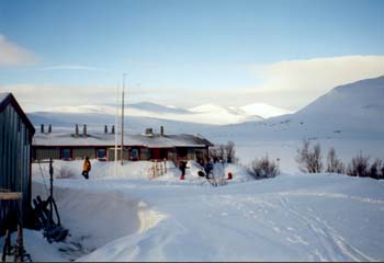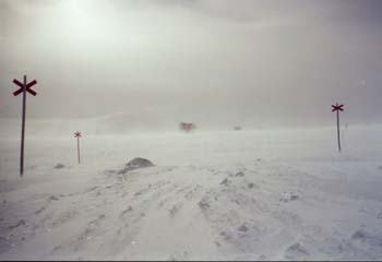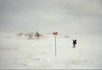 KreuzungHier begegnen sich die beiden markierten Wege von Helags und Gåsen. Im Gegenlicht glitzert der aufgewirbelte Schnee. Von Helags müssen die Franzosen gekommen sein, die wir auf der Hütte wiedertreffen. |