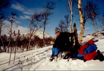 SonnenpauseTraumwetter heut! Die Sonne strahlt den ganzen Tag, und es ist nahezu windstill. Die Strecke führt immer an der Baumgrenze lang. Sie ist deutlich anspruchsvoller als im Hochgebirge. Bei kurzen steilen Abfahrten hat man kaum Platz um zu bremsen. Der ein oder andere Ausrutscher lässt sich da nicht vermeiden. Peinlich, wenn man gerade darniederliegt und die Hüttenwirtin vorbei kommt. Sie fragt mich, ob ich denn angeln wolle. Fast wäre ich nämlich in den Bach gefallen, der hier offen zu Tal fließt! Auf diesen Schreck ist dann erst mal Pause angesagt. In der Sonne lässt es sich lange aushalten. |