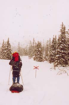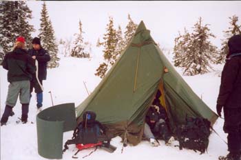 Traumhafter SchneeDer immer noch niedergehende Schnee macht das Skifahren zum Traum. Leicht bergab schlängelt sich die Spur zunächst durch den lichten Wald. Zur Halbzeit machen wir an einer Rasthütte halt und genehmigen uns ein ordentliches Mittagessen. Ab hier geht es wieder bergauf. Nach weiteren sechs Kilometern reicht es uns für heute. Wieder suchen wir uns einen schönen, abgestorbenen Baum und bauen das Zelt in seiner Nähe auf. Es dauert fast zwei Stunden und erfordert den Einsatz aller Fünf, um die Fichte zu erlegen. Wir haben dazugelernt: Bevor wir das Feuer entzünden, graben wir uns neben dem Feuer gleich in den Schnee ein. So haben wir länger etwas von der Wärme. Am Abend zuvor war das Feuer nach und nach im Schnee versunken... |