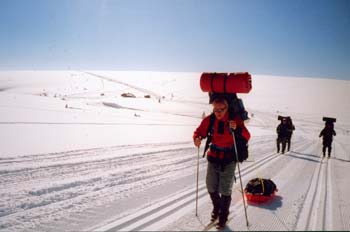 Kein WindDas Pistenmobil scheucht uns auf und hinterlässt eine wunderbare Loipe. Schnell haben wir die höchste Stelle des heutigen Tages bei knapp 900 Metern erreicht. Ab hier geht es dann zunächst fast 500 Höhenmeter zu Tal. Wir befinden uns auf dem berühmten Kungsleden. Dieser beginnt hier irgendwo in Dalarna und führt bis hinauf nach Lappland. Vor drei Jahren waren wir auf dem nördlichsten Abschnitt unterwegs. Schöne Vorstellung, auf diesem Pfad einfach immer weiter gen Norden zu ziehen... |