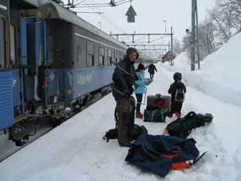 Erste Versuche mit PulkaNachdem die Pulka endlich gut bepackt ist, die Sonne doch noch zum Vorschein kommt, geht es los. Der selbstgenähte Ziehgurt funktioniert wunderbar. Und die an den Plastikschlitten genietete Plane hält, was sie verspricht: kein Problem mit Schnee in der Pulka. Soweit erst mal alles beim Besten. Der mangelnde Schlaf macht sich allerdings bemerkbar. Ziemlich schlapp kommen wir den ersten Hang hinauf. Bis Blåhammaren wird das wohl nix heute. Wir beschließen, in Storvallen die Jugendherberge aufzusuchen - eine gute Entscheidung. |