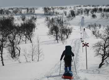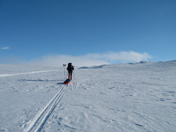 Die letzten Meter zur Hütte werden mühsam. Meine Kondition ist alles andere als gut. Die Pulka zieht mit aller Macht zu Tal - die falsche Richtung. |