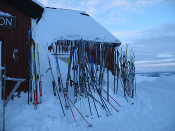 Die Zahl der Skier vor der Hütte deutet es an: die Hütte ist voll. Wir bekommen noch zwei Betten im Viererzimmer. Auf Sauna verzichten wir und fallen um 9 Uhr ins Bett. |