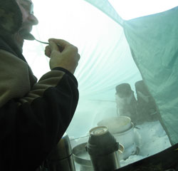 ZeltenAm Morgen ist klar, warum der Schlafsack nicht mehr das gehalten, was er einst versprochen hat. -9 Grad in der Bude. Wie kalt war es wohl draußen? Das gesamte Kondenswasser hat sich an der Innenseite des Zeltes niedergeschlagen. Bei jeder Bewegung schneit es im Zelt.