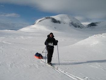 AbkürzungDer Weg führt nun Richtung Osten am Nordufer des Sees zurück auf den Kungsleden. Immer das Helagsmassiv vor Augen, und heute den Wind von vorn. Es geht durch lichten Wald, immer mal wieder auf und ab. Nach drei Stunden erreichen wir das Ende des Sees und machen in einem Schneeloch kurz Rast. Beim Losfahren frieren wir ein. Es dauert eine quälende halbe Stunde bis uns endlich wieder warm wird. Die Schmerzen treiben einem die Tränen in die Augen. Der Wind ist wirklich heftig. Bei maximal -11 Grad und mäßigem bis frischem Wind bedeutet dies mit Windchillfaktor etwa -30 Grad. Stehen bleiben ist fast unmöglich. |