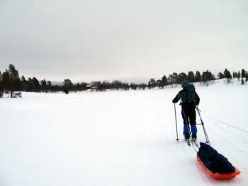 Wieder spurlosEin letzter Blick auf den Skedbrotoppen im Westen, dann geht es Richtung Südost geradewegs nach Käringsjön. Endlich keine roten Kreuze mehr! Nur mit Weidenruten ist der Weg gespurt. Am frühen Nachmittag lockert die Bewölkung auf und es wird sonnig. |